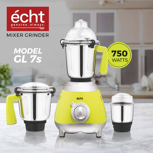 Echt GL 7S Mixer Grinder 750 Watt, 3 Stainless Steel Jars, Wet Jar (1500 ml), Multipurpose Jar (1000 ml) and Chutney Jar (300ml); with 3 Speed Control, with 2 years warranty, Green + Silver