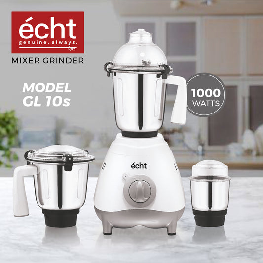 Echt GL 10S Mixer Grinder 1000 Watt, 3 Stainless Steel Jars, Wet Jar (1500 ml), Multipurpose Jar (1000 ml) and Chutney Jar (300ml); with 3 Speed Control, with 2 years warranty, White