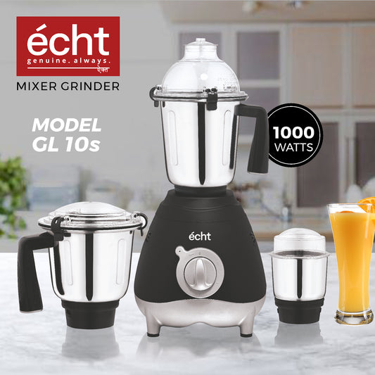 Echt GL 10S Mixer Grinder 1000 Watt, 3 Stainless Steel Jars, Wet Jar (1500 ml), Multipurpose Jar (1000 ml) and Chutney Jar (300ml); with 3 Speed Control, with 2 years warranty, Black