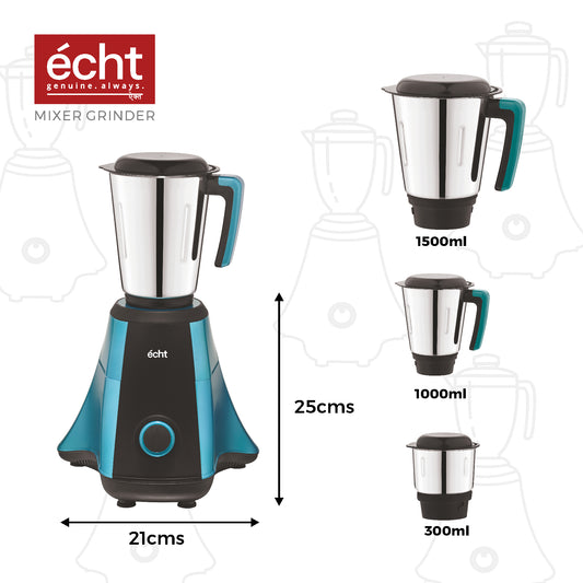 Echt NT 7s Mixer Grinder 750 Watt, 3 Stainless Steel Jars,Wet Jar (1500 ml), Multipurpose Jar (1000 ml), Chutney Jar (300ml); with 3 Speed Control, with 2 years warranty, Blue