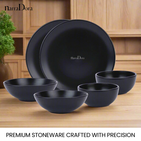 Narradora Sango Coupe Stoneware Dinner Set of 6 Pcs | 2 Pcs Dinner Plates, 4 Pcs Veg Bowls | Premium Crockery Perfect for Gifiting | Stoneware | Dinner Set | Matt Finish | Black