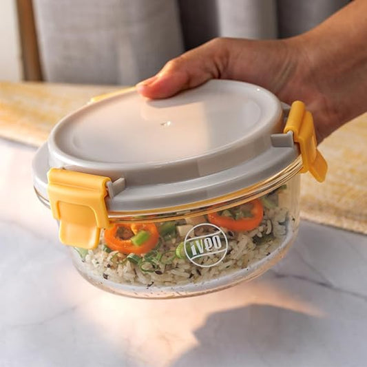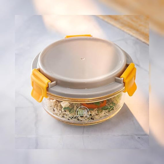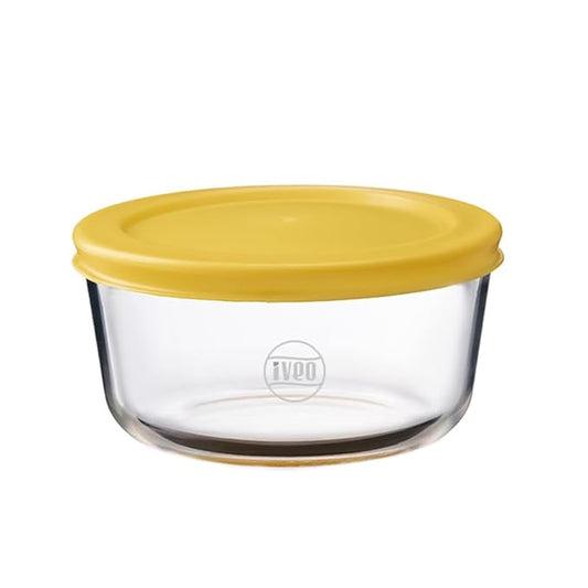 Iveo Borosilicate Glass Container, Fresh Mate | Microwave Safe Food Container | Cook Serve Store | for Carrying and Storing Food | Fresh Storage | 472 ml, Round, 2 Pcs, Yellow