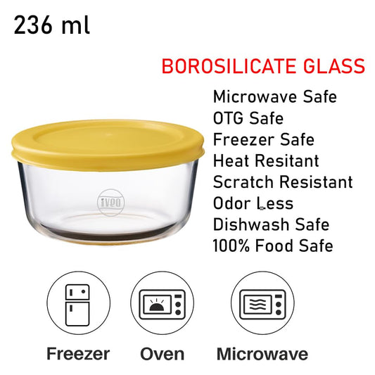 Iveo Borosilicate Glass Container, Fresh Mate | Microwave Safe Food Container | Cook Serve Store | for Carrying and Storing Food | Fresh Storage | 236 ml, Round, 2 Pcs, Yellow