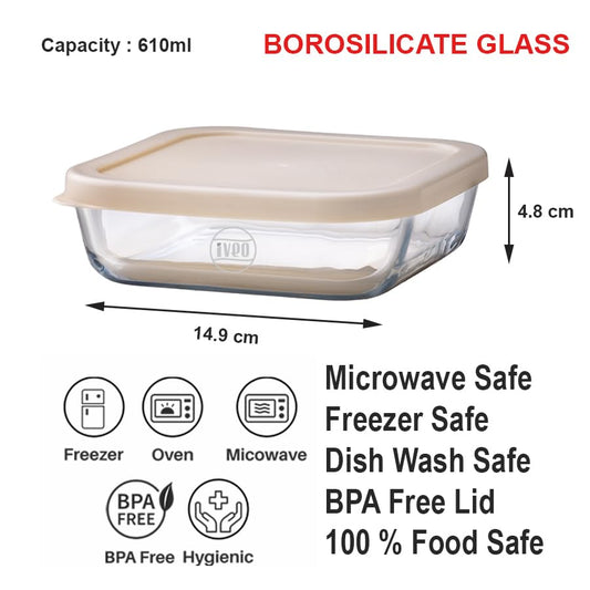 IVEO Borosilicate Glass Container, Fresh Mate | Microwave Safe Food Container | Cook Serve Store | for Carrying and Storing Food | Slim Food Container | Stay Healthy | 610 ml, Square, 1 Pc, Beige