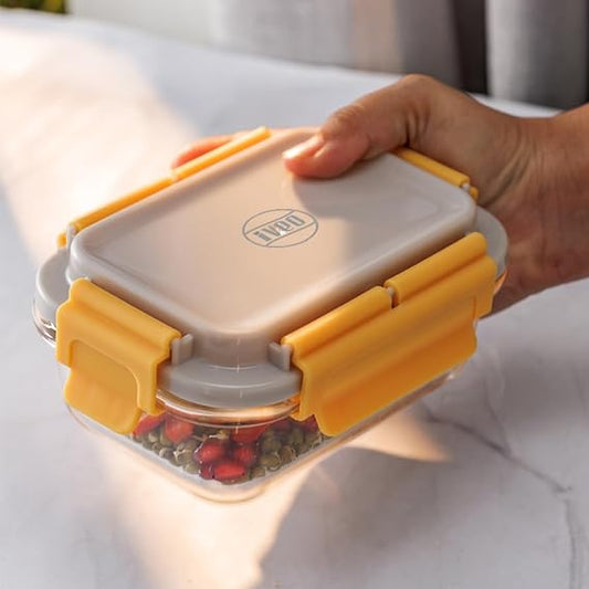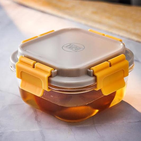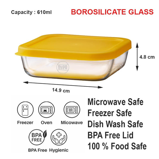 IVEO Borosilicate Glass Container, Fresh Mate | Microwave Safe Food Container | Cook Serve Store | for Carrying and Storing Food | Slim Food Container | Stay Healthy | 610 ml, Square, 1 Pc, Yellow