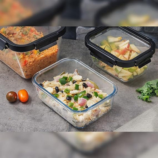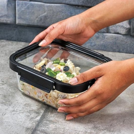 IVEO Borosilicate Glass Container, Glass N Glass | Microwave Safe Food Container | Cook Serve Store | for Carrying and Storing Food | with GLASS LID | Leak proof | 1050 ml, Rectangle, 1 Pc, Black