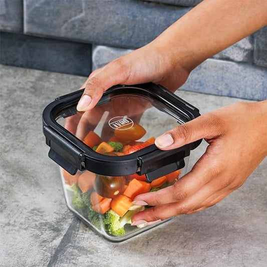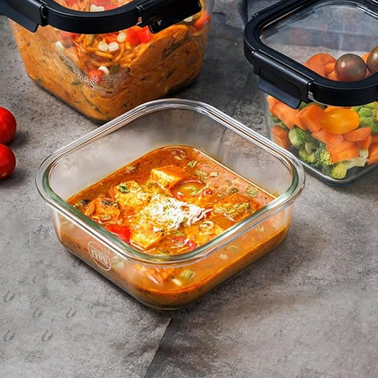 IVEO Borosilicate Glass Container, Glass N Glass | Microwave Safe Food Container | Cook Serve Store | for Carrying and Storing Food | with GLASS LID | Leak proof | 1100 ml, Square, 1 Pc, Black