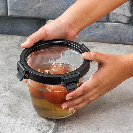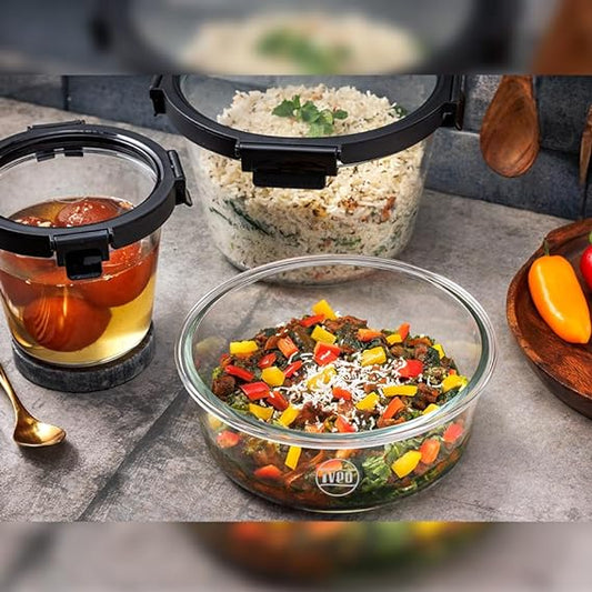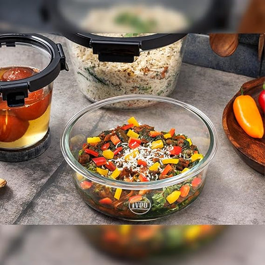 IVEO Borosilicate Glass Container, Glass N Glass | Microwave Safe Food Container | Cook Serve Store | for Carrying and Storing Food | with GLASS LID | Leak proof | 650 ml, Round, 1 Pc, Black