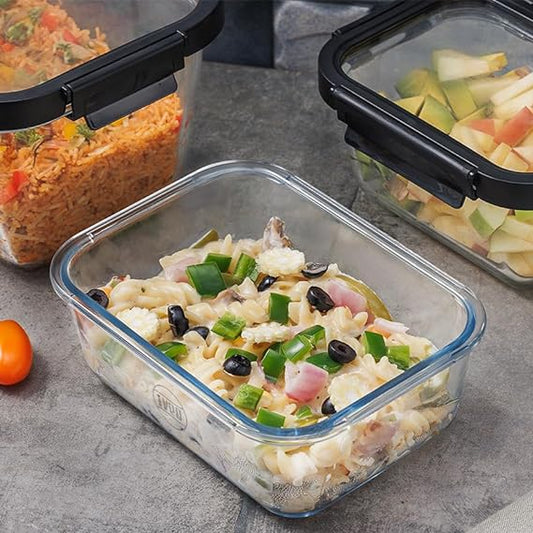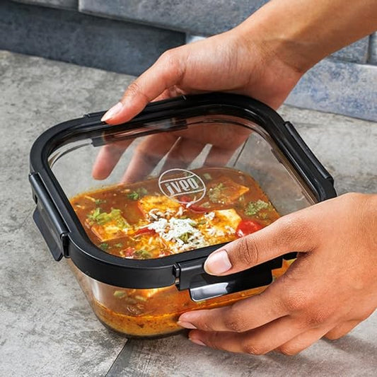 IVEO Borosilicate Glass Container, Glass N Glass | Microwave Safe Food Container | Cook Serve Store | for Carrying and Storing Food | with GLASS LID | Leak proof | 640 ml, Rectangle, 1 Pc, Black