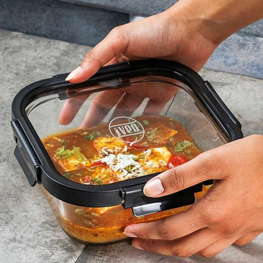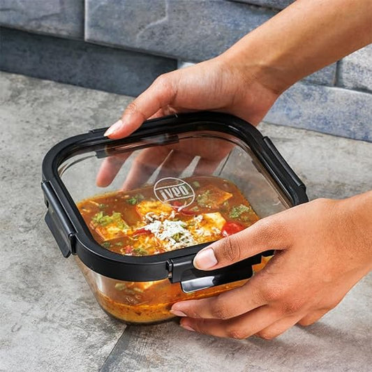 IVEO Borosilicate Glass Container, Glass N Glass | Microwave Safe Food Container | Cook Serve Store | for Carrying and Storing Food | with GLASS LID | Leak proof | 520 ml, Square, 1 Pc, Black