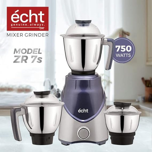 Echt ZR 7S Mixer Grinder 750 Watt, 3 Stainless Steel Jars, Wet Jar (1500 ml), Multipurpose Jar (1000 ml) and Chutney Jar (300ml) ; with 3 Speed Control, with 2 years warranty, Silver + Blue