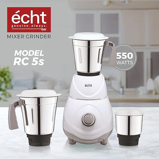 Echt RC 5s Mixer Grinder 550 Watt, 3 Stainless Steel Jars,Wet Jar (1500 ml), Multipurpose Jar (1000 ml), Chutney Jar (300 ml); with 3 Speed Control, with 2 years warranty, White