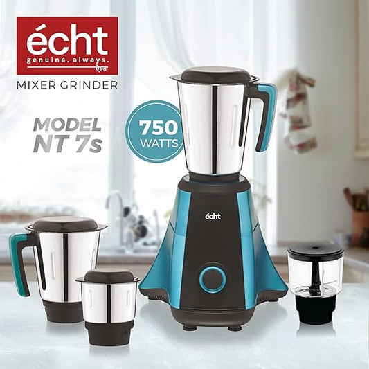 Echt NT 7s Mixer Grinder 750 Watt, 4 Stainless Steel Jars,Wet Jar (1500 ml), Multipurpose Jar (1000 ml), Chutney Jar (300ml) & Chopper Jar (500ml); with 3 Speed Control, with 2 years warranty, Blue