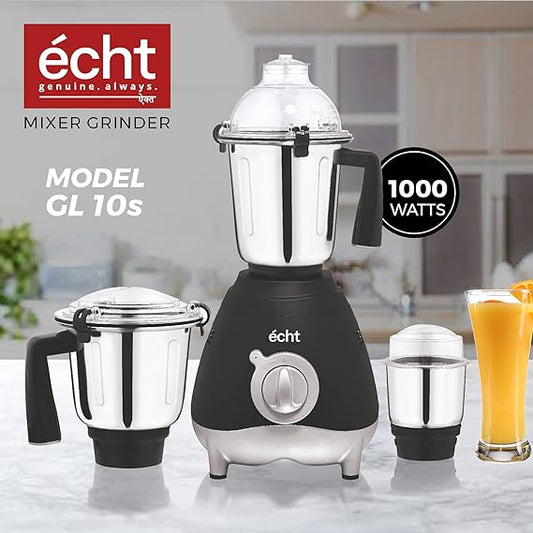 Echt GL 10S Mixer Grinder 1000 Watt, 3 Stainless Steel Jars, Wet Jar (1500 ml), Multipurpose Jar (1000 ml) and Chutney Jar (300ml); with 3 Speed Control, with 2 years warranty, Black