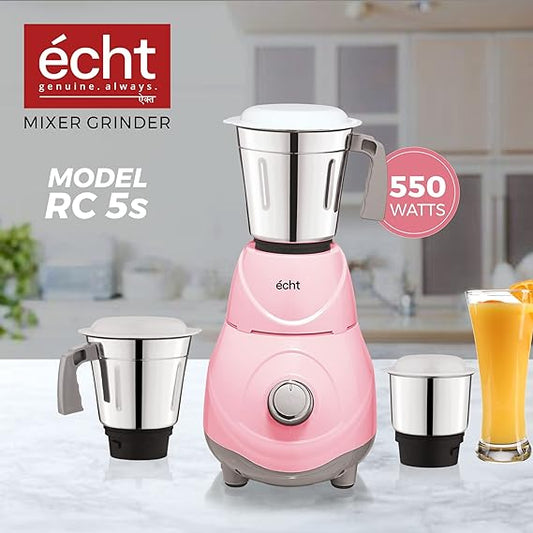 Echt RC 5s Mixer Grinder 550 Watt, 3 Stainless Steel Jars,Wet Jar (1500 ml), Multipurpose Jar (1000 ml), Chutney Jar (300 ml); with 3 Speed Control, with 2 years warranty, Pink