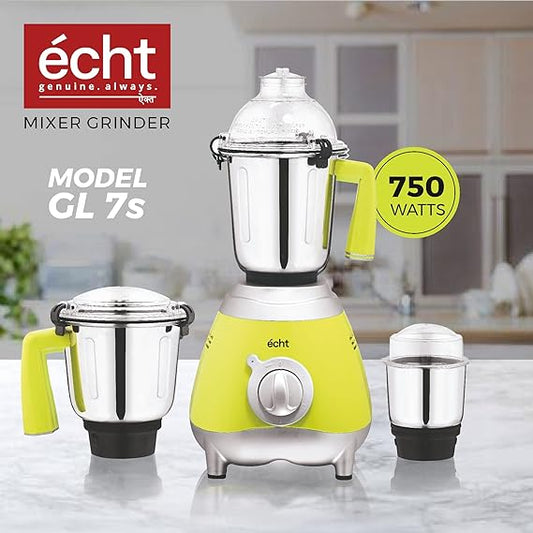 Echt GL 7S Mixer Grinder 750 Watt, 3 Stainless Steel Jars, Wet Jar (1500 ml), Multipurpose Jar (1000 ml) and Chutney Jar (300ml); with 3 Speed Control, with 2 years warranty, Green + Silver
