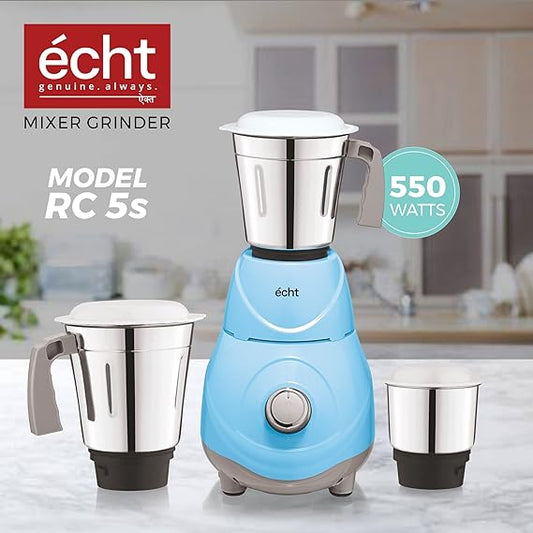Echt RC 5s Mixer Grinder 550 Watt, 3 Stainless Steel Jars,Wet Jar (1500 ml), Multipurpose Jar (1000 ml), Chutney Jar (300 ml); with 3 Speed Control, with 2 years warranty, Blue