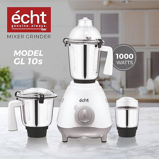 Echt GL 10S Mixer Grinder 1000 Watt, 3 Stainless Steel Jars, Wet Jar (1500 ml), Multipurpose Jar (1000 ml) and Chutney Jar (300ml); with 3 Speed Control, with 2 years warranty, White