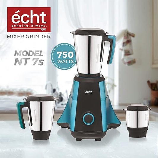 Echt NT 7s Mixer Grinder 750 Watt, 3 Stainless Steel Jars,Wet Jar (1500 ml), Multipurpose Jar (1000 ml), Chutney Jar (300ml); with 3 Speed Control, with 2 years warranty, Blue