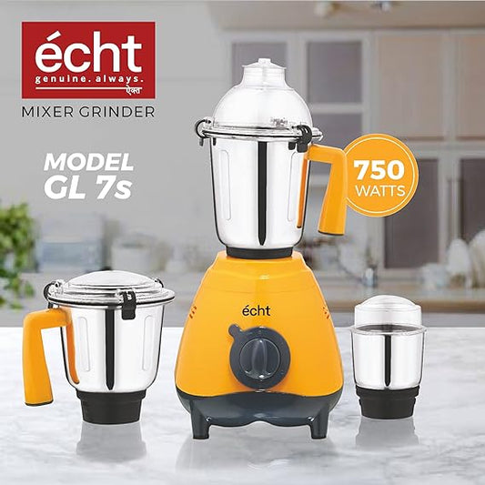 Echt GL 7S Mixer Grinder 750 Watt, 3 Stainless Steel Jars, Wet Jar (1500 ml), Multipurpose Jar (1000 ml) and Chutney Jar (300ml); with 3 Speed Control, with 2 years warranty, Mango + Grey