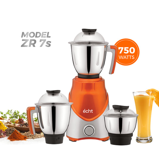 Echt ZR 7S Mixer Grinder 750 Watt, 3 Stainless Steel Jars, Wet Jar (1500 ml), Multipurpose Jar (1000 ml) and Chutney Jar (300ml); with 3 Speed Control, with 2 years warranty, Silver+ Orange
