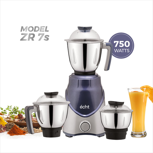 Echt ZR 7S Mixer Grinder 750 Watt, 3 Stainless Steel Jars, Wet Jar (1500 ml), Multipurpose Jar (1000 ml) and Chutney Jar (300ml) ; with 3 Speed Control, with 2 years warranty, Silver + Blue