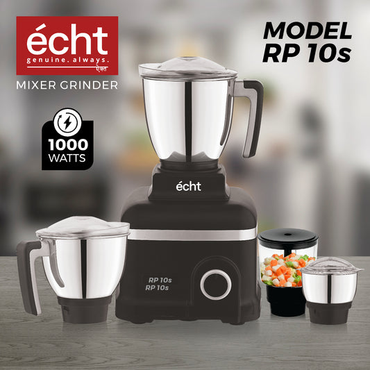 Echt RP 10s Mixer Grinder 1000 Watt,4 Stainless Steel Jars,Wet Jar (1500 ml), Multipurpose Jar (1000 ml), Chutney Jar (300 ml) and Chopper Jar (500ml);3 Speed Control, with 2 years warranty, Black