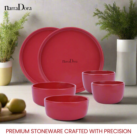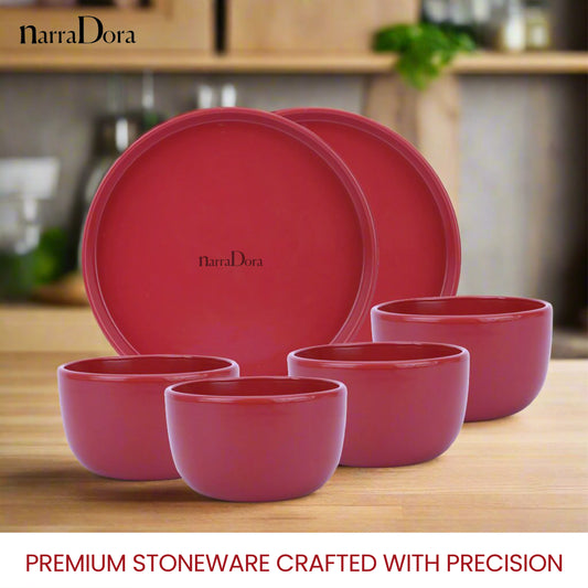 Narradora Zoro Stoneware Dinner Set of 6 Pcs | 2 Pcs Dinner Plates, 4 Pcs Veg Bowls | Premium Crockery Perfect for Gifiting | Stoneware | Dinner Set | Matt Finish | Red