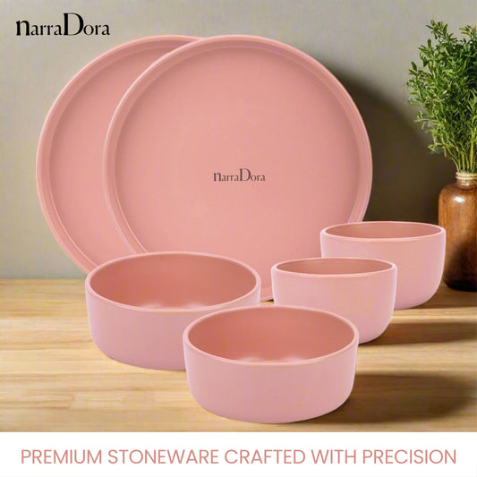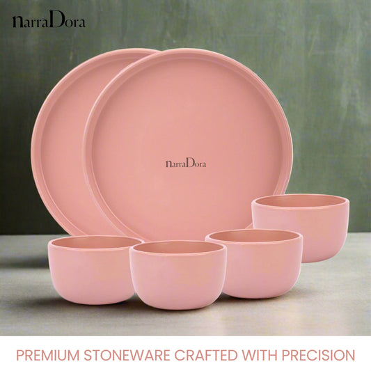 Narradora Zoro Stoneware Dinner Set of 6 Pcs | 2 Pcs Dinner Plates, 4 Pcs Veg Bowls | Premium Crockery Perfect for Gifiting | Stoneware | Dinner Set | Matt Finish | Pink