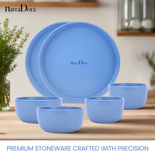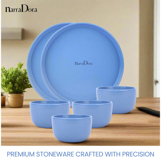 Narradora Zoro Stoneware Dinner Set of 6 Pcs | 2 Pcs Dinner Plates, 4 Pcs Veg Bowls | Premium Crockery Perfect for Gifiting | Stoneware | Dinner Set | Matt Finish | Blue