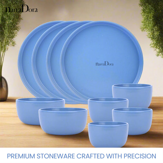 Narradora Zoro Stoneware Dinner Set of 10 Pcs | 4 Pcs Dinner Plates, 2 Pcs Serving Bowl, 4 Pcs Veg Bowls | Premium Crockery Perfect for Gifiting | Stoneware | Dinner Set | Matt Finish | Blue