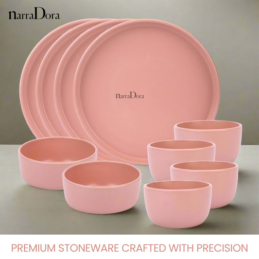 Narradora Zoro Stoneware Dinner Set of 10 Pcs | 4 Pcs Dinner Plates, 2 Pcs Serving Bowl, 4 Pcs Veg Bowls | Premium Crockery Perfect for Gifiting | Stoneware | Dinner Set | Matt Finish | Pink